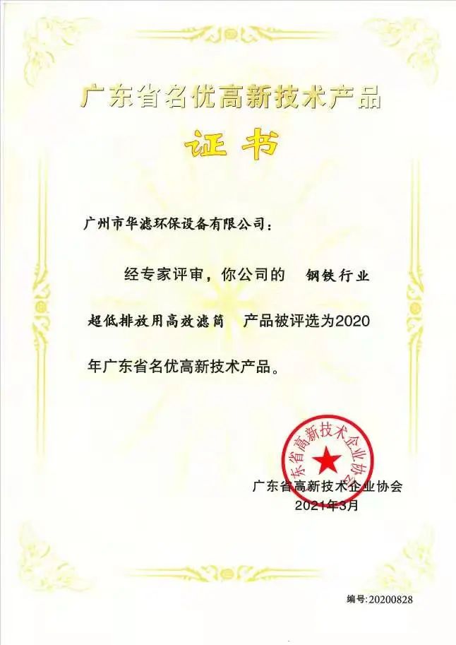 广州华滤自主研发的优氪迅®钢铁行业超低排放高效滤筒被评选为2020年广东省名优高新技术产品。