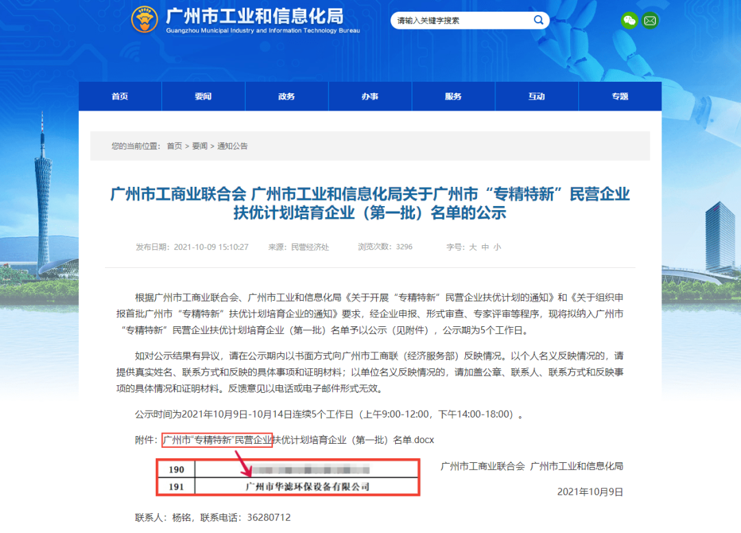 10月9日,广州市工商业联合会、广州市工业和信息化局平台公示了第一批“专精特新”民营企业扶优计划培育名单,广州市华滤环保设备有限公司作为入选该资质企业之一,与其他优秀企业同获此殊荣,共襄盛举!