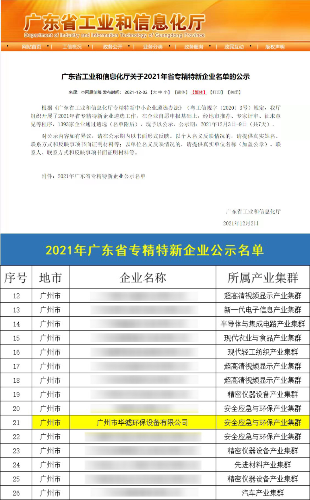 日前,广东省工业和信息化厅平台公示了2021年度省级“专精特新”企业名单。经过公示,广州市华滤环保设备有限公司(以下简称“华滤环保”)凭借强劲的研发实力、雄厚的技术创新能力,从众多企业中脱颖而出,成功荣获广东省“专精特新”企业称号。