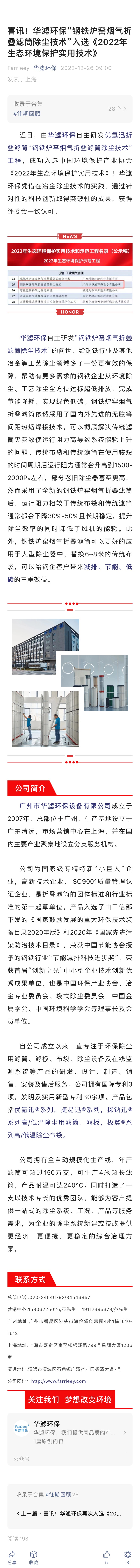 喜讯!华滤环保“钢铁炉窑烟气折叠滤筒除尘技术”入选《2022年生态环境保护实用技术》