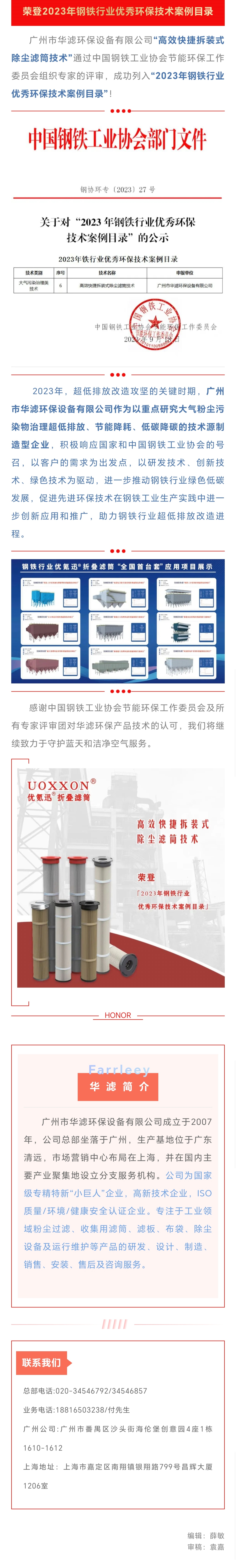 喜讯!华滤环保荣登“2023年钢铁行业优秀环保技术案例目录”